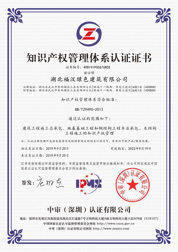 熱烈祝賀湖北福漢綠色建筑有限公司于2019年9月獲得知識產權貫標認證證書,這意味著福漢綠色在知識產權領域獲得到重要認可,在知識產權方面得到進一步規(guī)范和在綜合競爭力得到進一步提升。